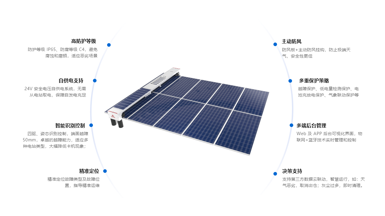 完全取代人工清扫保持组件表面清洁,平均提升组件发电效率8-15%,用户安装2年内即可收回成本。